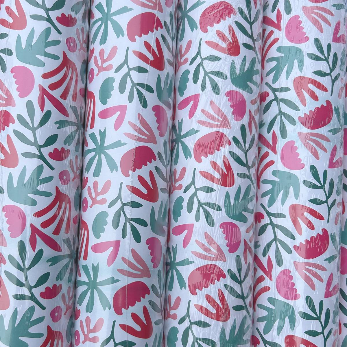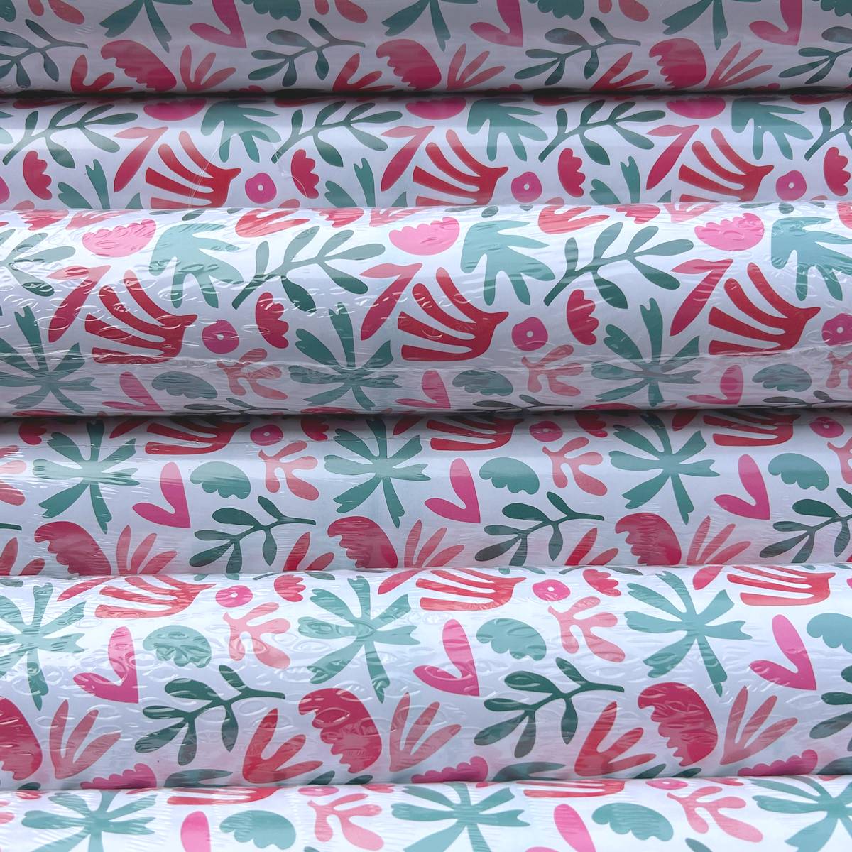 Du papier d’emballage cadeau blanc imprimé avec des formes de différentes couleurs (2 tons de rose et 2 de vert).