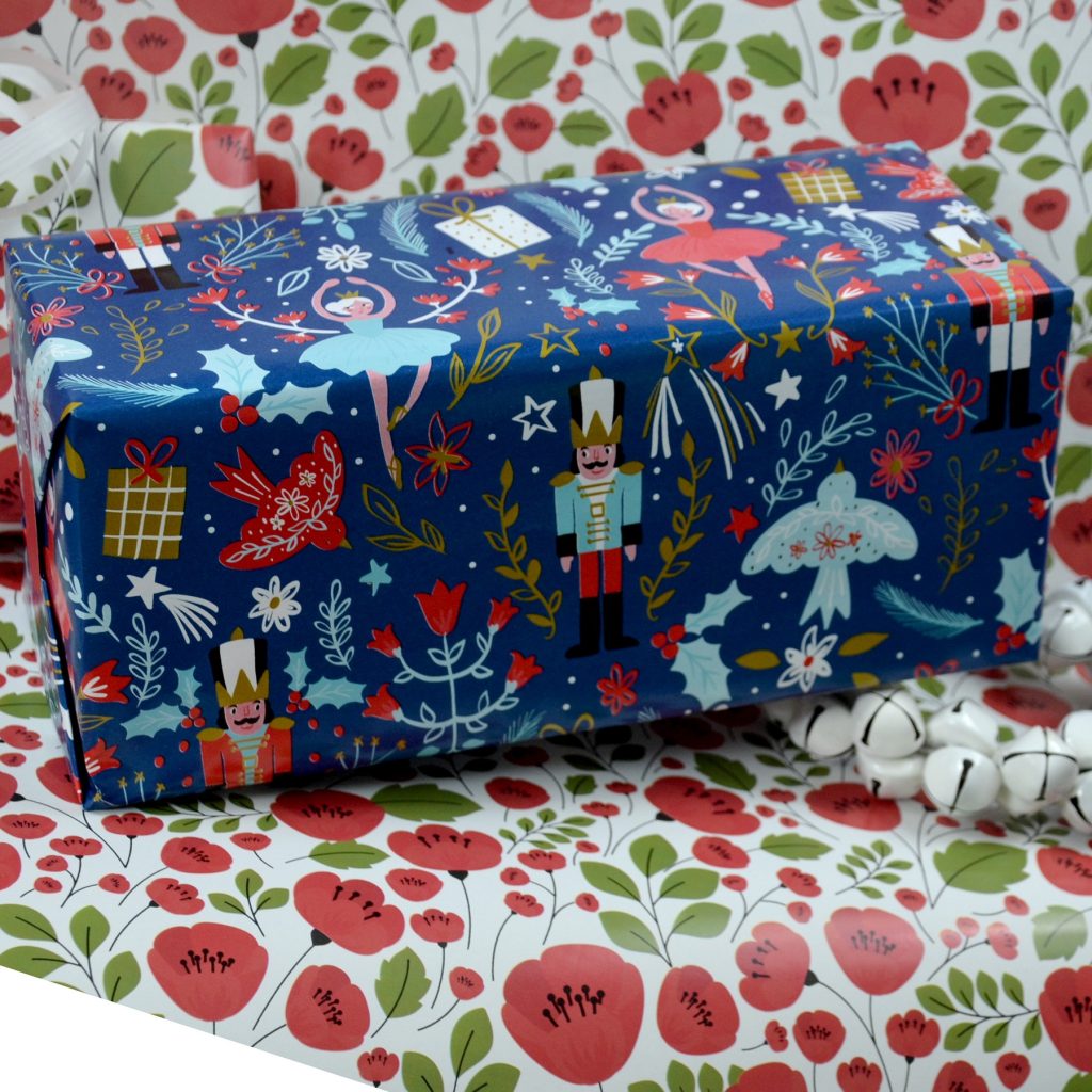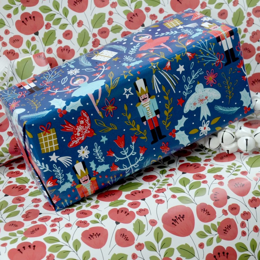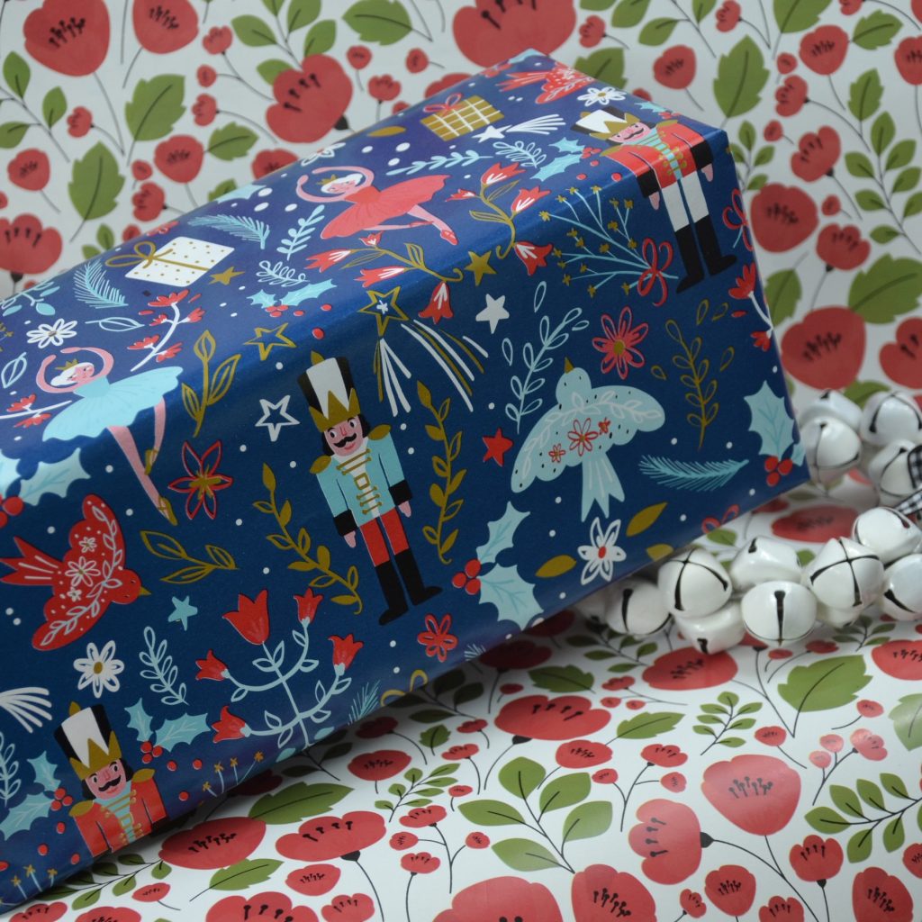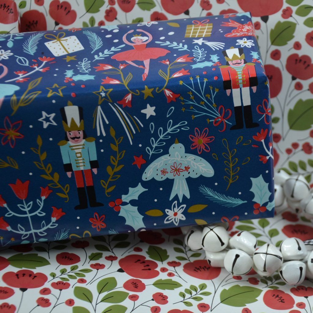 Gift Wrapping Paper couché blanc avec des éléments imprimés en bleu / vert foncé : soldats en bois, poupées danseuses, oiseaux, houx, paquets cadeaux, étoiles …. Tout un programme folklorique !