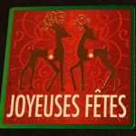 Boîte distributrice de 500 étiquettes adhésives “Joyeuses Fêtes” sur papier rouge Noël avec bordure verte et avec impression de rennes en doré brillant