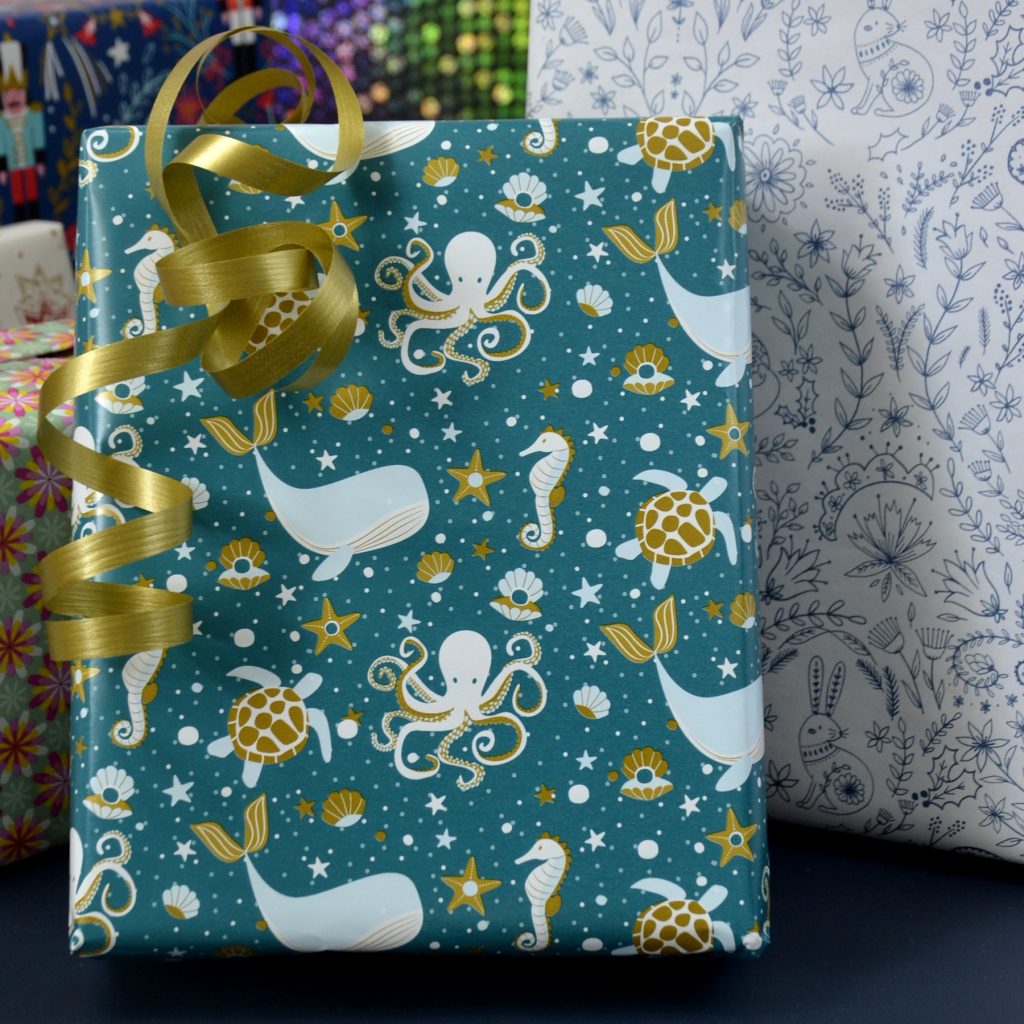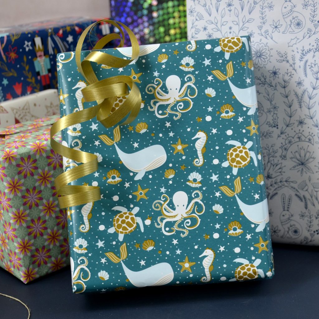 Nouveauté Eté 2025 … Un très beau motif …Le monde sous-marin sur un papier lisse imprimé vert bleu. Motifs très fins …. Cachalot, tortue de mer, hippocampe, etc.
