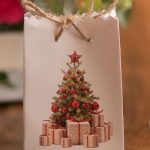 Minis Sacs Cabas en papier blanc mat avec impression d’un sapin décoré de boules etc. avec, à son pied des paquets cadeaux en kraft avec des motifs blancs et du ruban rouge …. Ambiance Noël, poignées souples en ficelle de corde naturelle